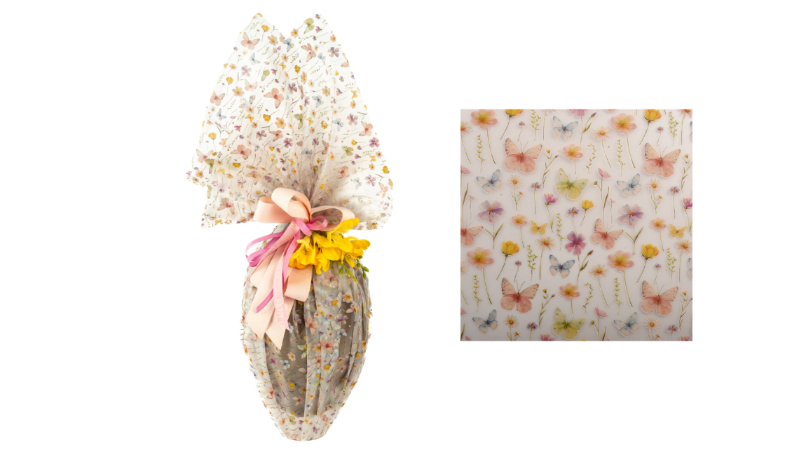 Un incarto estremamente elegante e originale, ideale per valorizzare il contenuto senza nasconderlo: la trasparenza opaca della Butterflies lascia intravedere l’interno, creando un effetto sofisticato e curato, perfetto per uova, colombe e dolci artigianali.