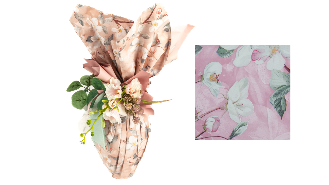 Con questa carta sboccia la primavera! Un incarto delicato ma importante, molto naturale. Il polipropilene con fantasia fiori di pesco su base rosa valorizza colombe e uova di cioccolato con un’eleganza primaverile dal gusto romantico.