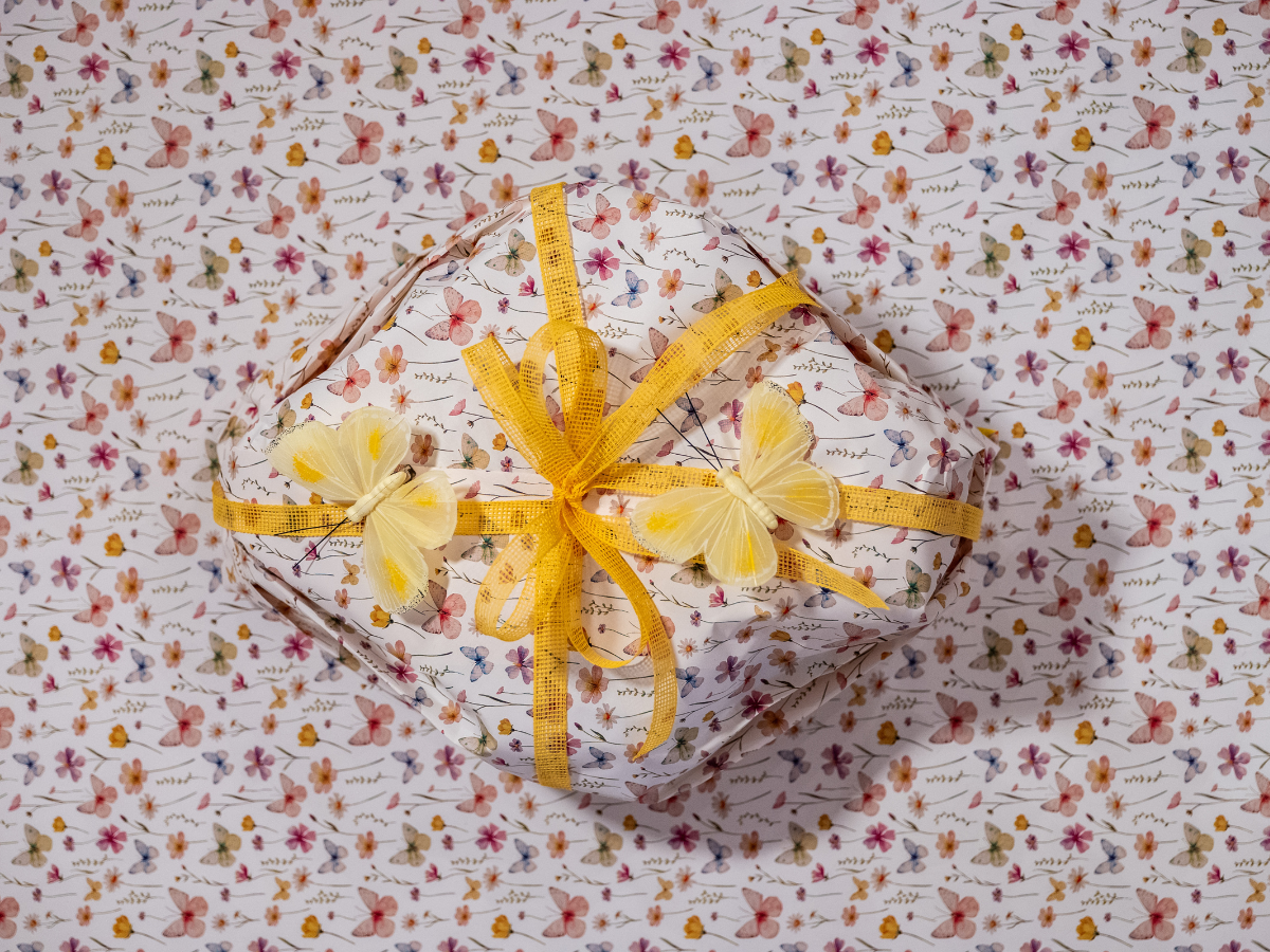 La fantasia con farfalle e fiorellini di campo nei toni pastello è il connubio perfetto della primavera e dei colori, rendendo ogni confezione fresca e luminosa.